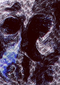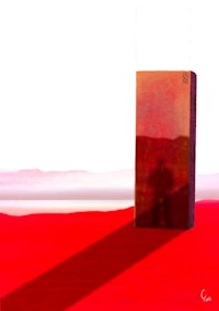 An unseen figure wanders through a desert of red sand. It comes upon a tall slab of polished stone carved with mysterious inscriptions. As it gazes at the surface, it sees a shadow cast upon it and says, “I see myself.